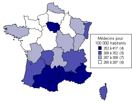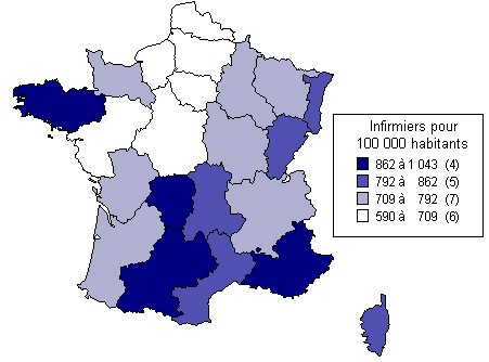 Les professionnels de santé tels que les médecins ou les infirmiers sont concentrés dans le Sud de la France et en Ile-de-France. On compte en région parisienne 4,1 médecins pour 1 000 habitants, tandis que la Picardie n’en dispose que de 2,6. Soit un potentiel de 242 patients par médecin en Ile-de-France contre 385 en Picardie. On notera tout de même que, paradoxalement, la région parisienne fait partie des régions les moins bien dotées en infirmiers.