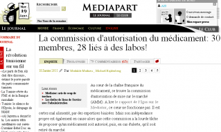 ![]() > Cliquez sur l'image pour un gros plan < | Le scandale du Mediator n'en finit plus d'éclairer les coulisses de l'industrie du médicament. Exemples à l'appui, Mediapart pointe les collusions entre la commission d'autorisation de mise sur la marché et les laboratoires. La commission d'autorisation de mise sur le marché, (AMM), organe de l'Afssaps, est chargée de proposer au directeur de l'Afssaps qu'un médicament soit autorisé, ou bien qu'il soit retiré du marché en cas d'alerte. Mediapart a enquêté sur les membres de la commission actuelle, qui a été renouvelée en partie en 2010. Verdict : sur 30 membres, 28 sont liés à des labos, alors qu'ils sont censés juger les médicaments en toute impartialité. |