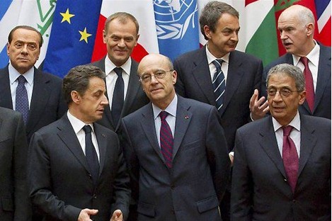 ![]() > Cliquez sur l'image pour un gros plan < | A quoi se monte exactement "la participation des pays arabes" à la guerre ? Les Occidentaux répètent jusqu'à l'obsession qu'il ne s'agit pas...d'une opération occidentale. Pour preuve: "la participation du monde arabe". Et les cadreurs de la photo du sommet de l'Elysée ont pris soin de placer le secrétaire de la Ligue Arabe, Amr Moussa, ...à la gauche des invitants. Samedi soir, à France 2 qui ne mentionnait parmi les pays participants que le Qatar; Juppé a fièrement ajouté: "et les Emirats Arabes Unis". Il est vrai qu'il se targuait quelques jours plus tôt sur son blog de pouvoir obtenir le soutien de "plusieurs" pays arabes. Très bien. Où sont les autres ? |