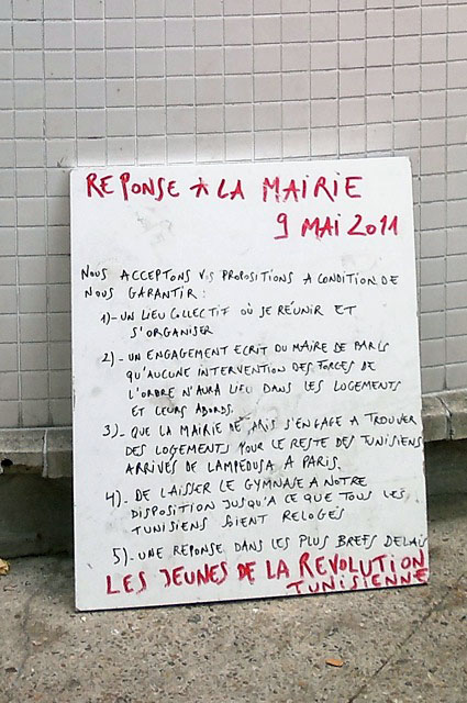 D’accord mais, objectera-t-on, quel rapport immédiat entre l’effervescence sociale là-bas, l’hypocrisie de la couverture média ici et le mauvais sort des réfugiés s’amassant vers la porte de La Villette ou se donnant un début d’expression autonome dans le gymnase de la rue Fontaine au Roi ? Le rapport est permanent, transversal et essentiel. Il suffit d’avoir assisté à quelques bribes d’Assemblée Générale du Collectif des Tunisiens de Lampedusa pour s’en rendre compte.